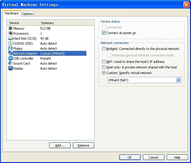 2.然后将VM的网卡设置为VMnet8(NAT):