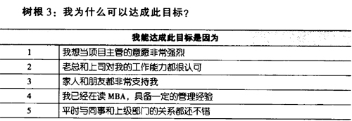 1.将“树根”写在一张质量比较好的卡片上,或者写在记事本的第一页,将“树根”保留到目标达成以后。